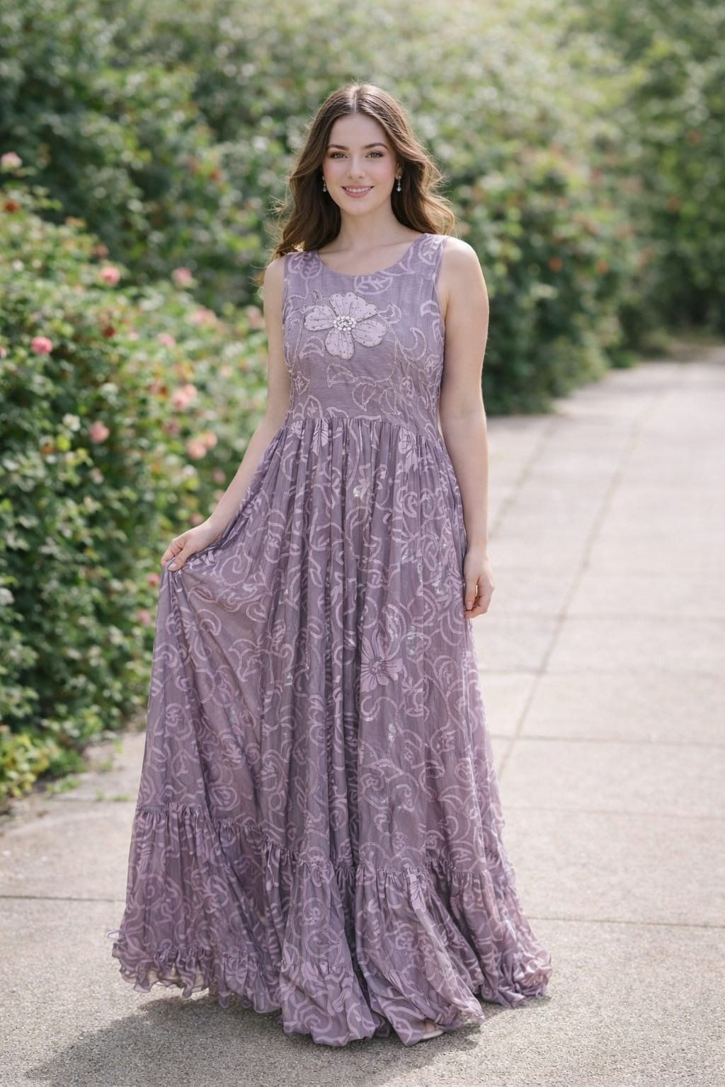 Graceful lavender maxi dress made from a soft chiffon–georgette blend with lightweight flowy fabric and inner lining. Perfect for party wear and casual elegant outings.