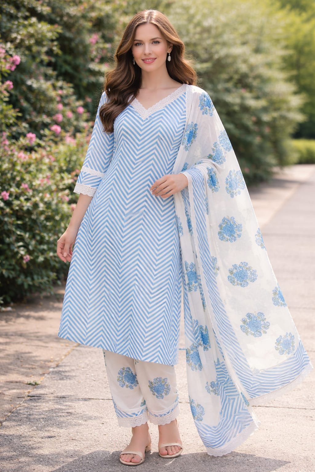 Refresh your ethnic wardrobe with this beautiful sky blue and white printed kurti set designed for comfort and elegance. The kurti is made from soft cotton blend fabric featuring a stylish chevron stripe pattern with delicate lace detailing on the neckline and sleeves, giving it a modern yet traditional appeal.