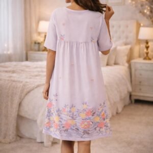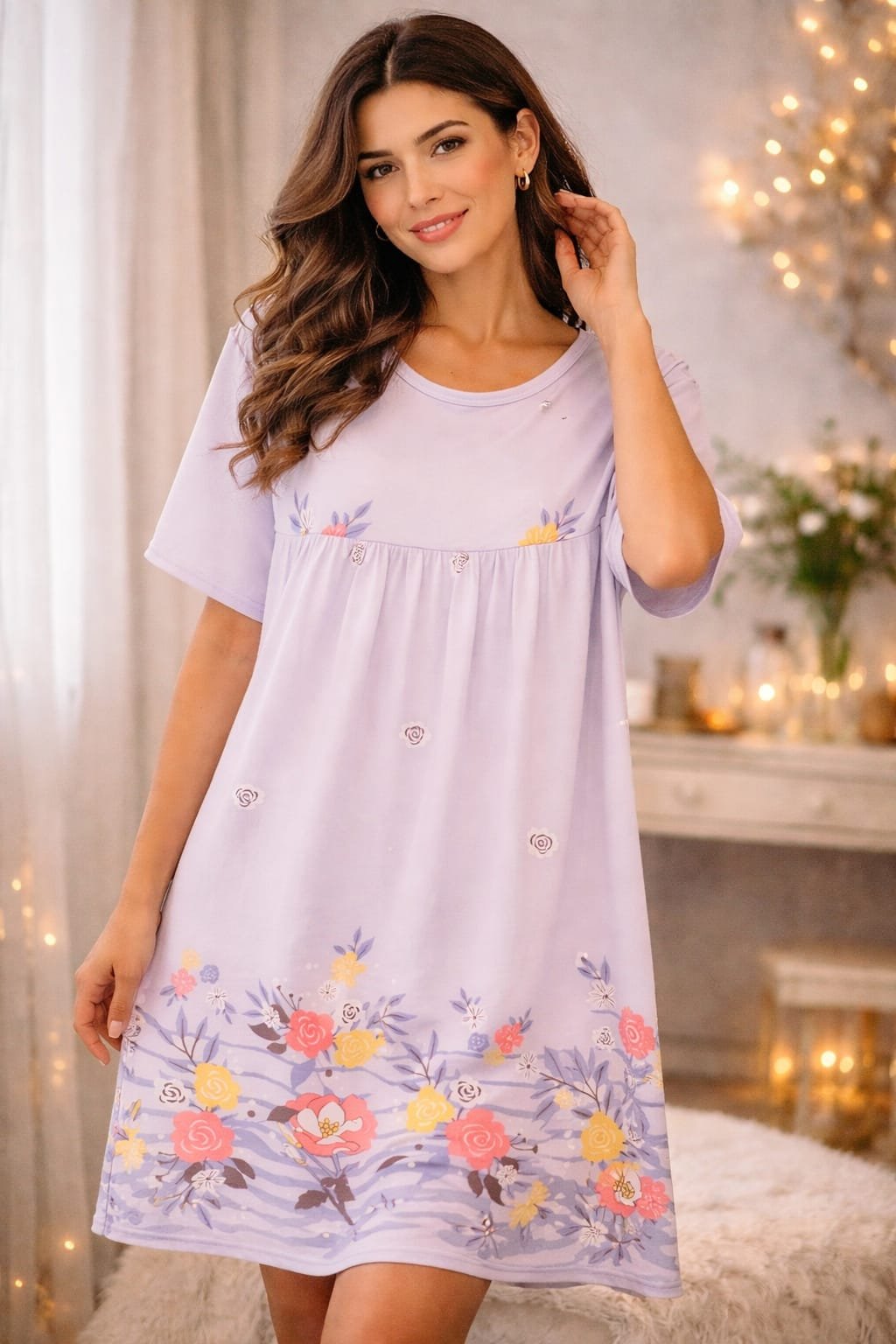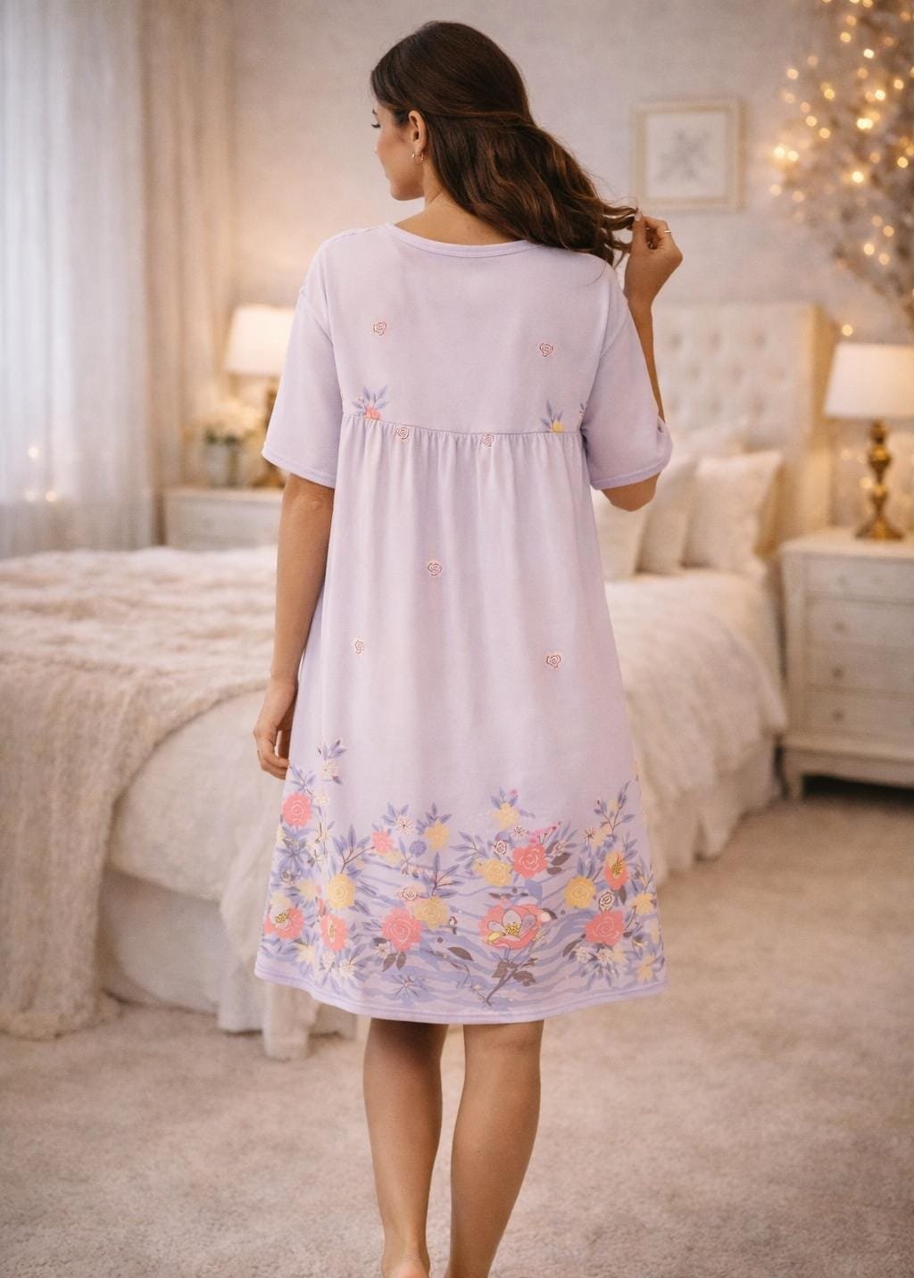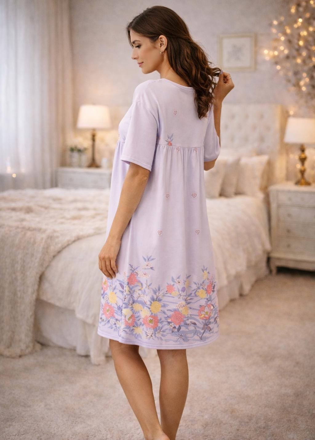 The night dress features a loose and flowy silhouette that allows easy movement and maximum comfort. The round neckline and short sleeves give it a simple yet elegant look, while the delicate floral print on the lower part of the dress adds a charming and feminine touch.